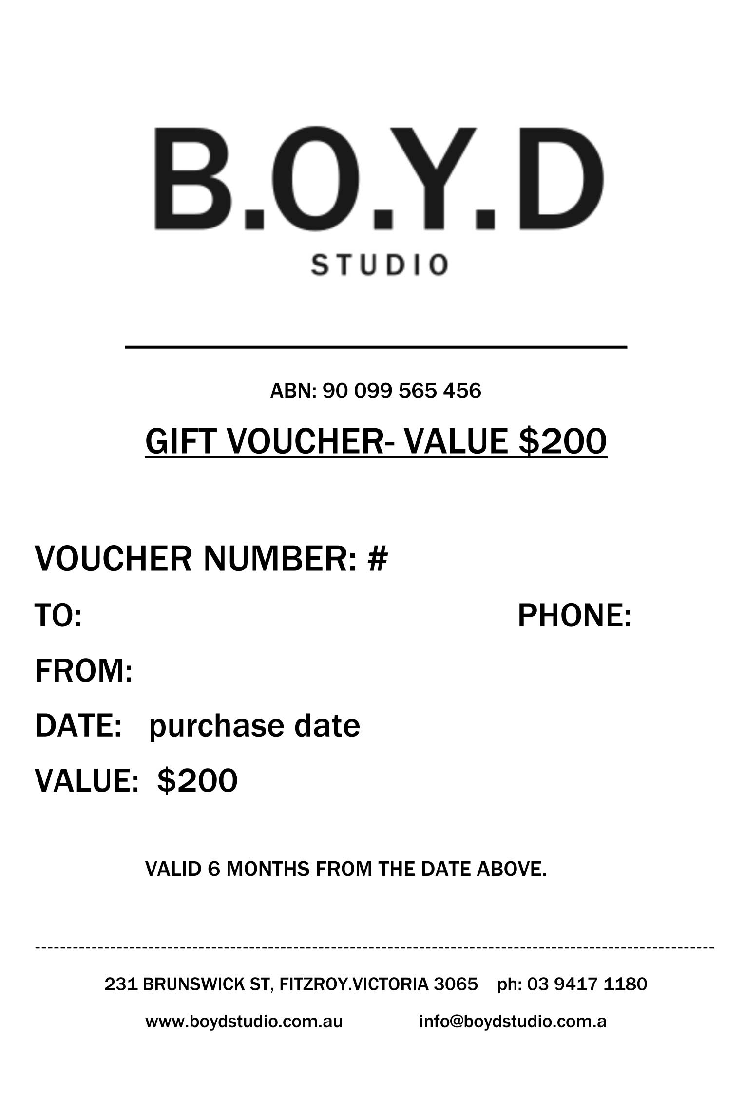 BOYD STUDIO GIFT VOUCHER- VALUE $200 quantity