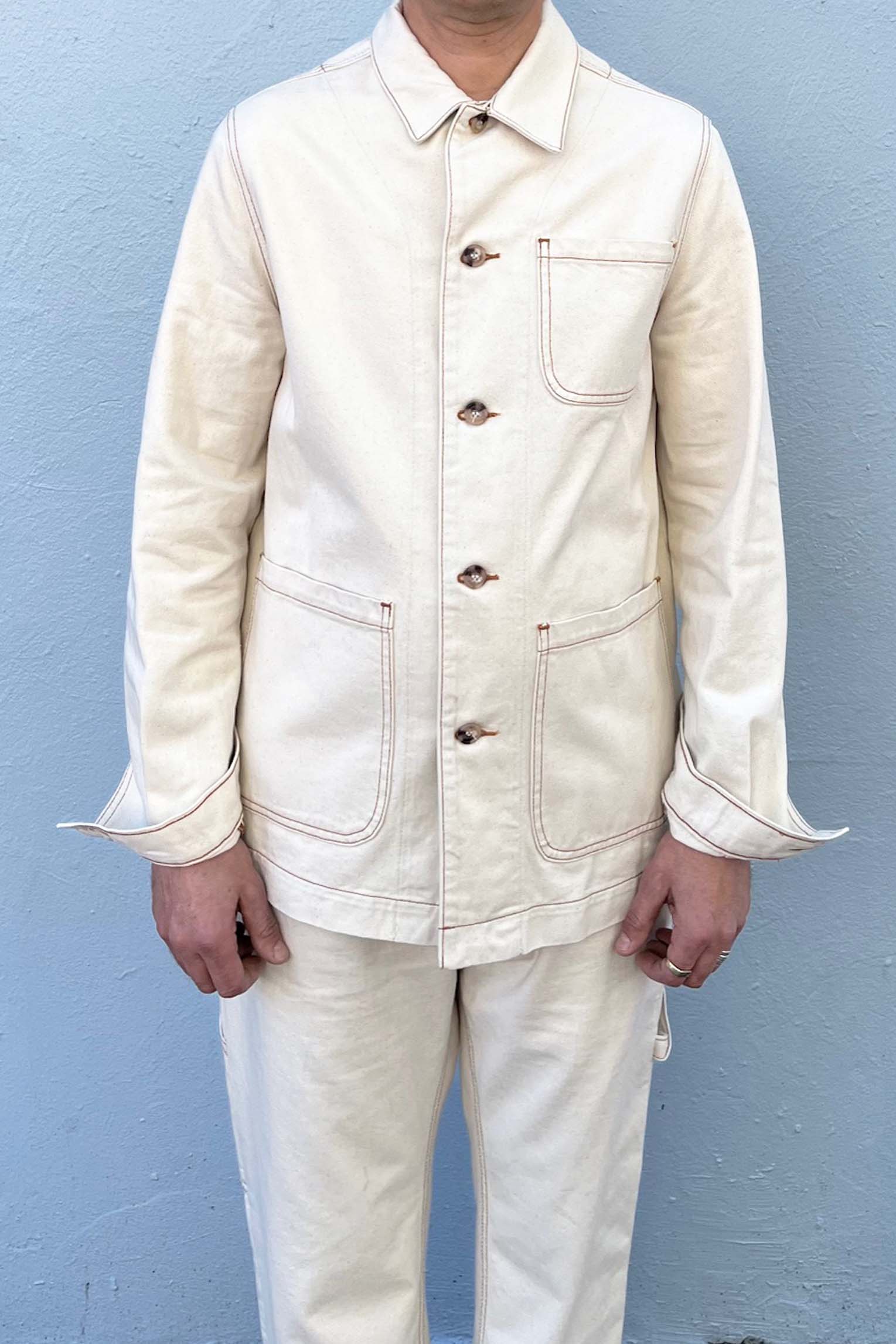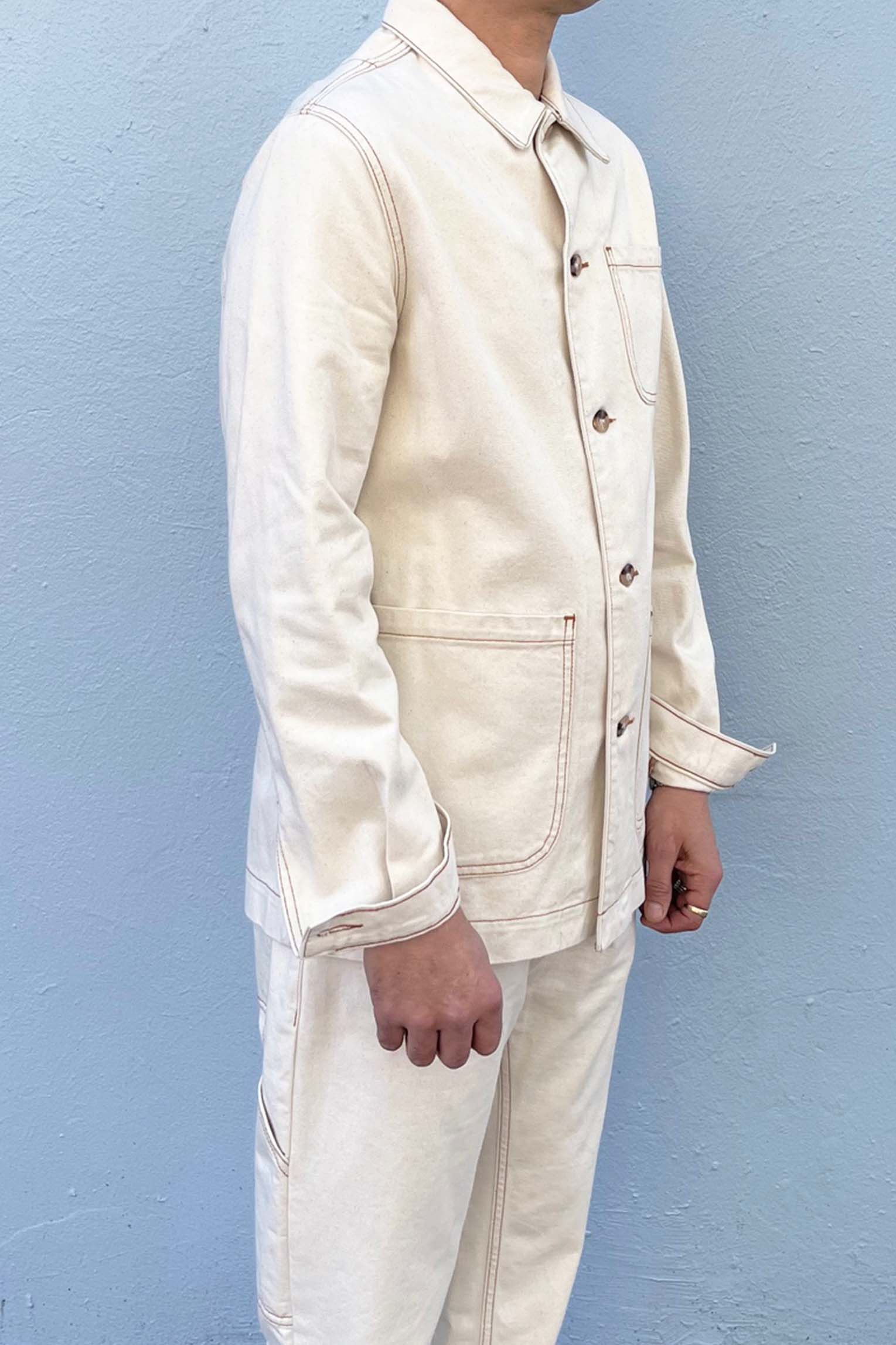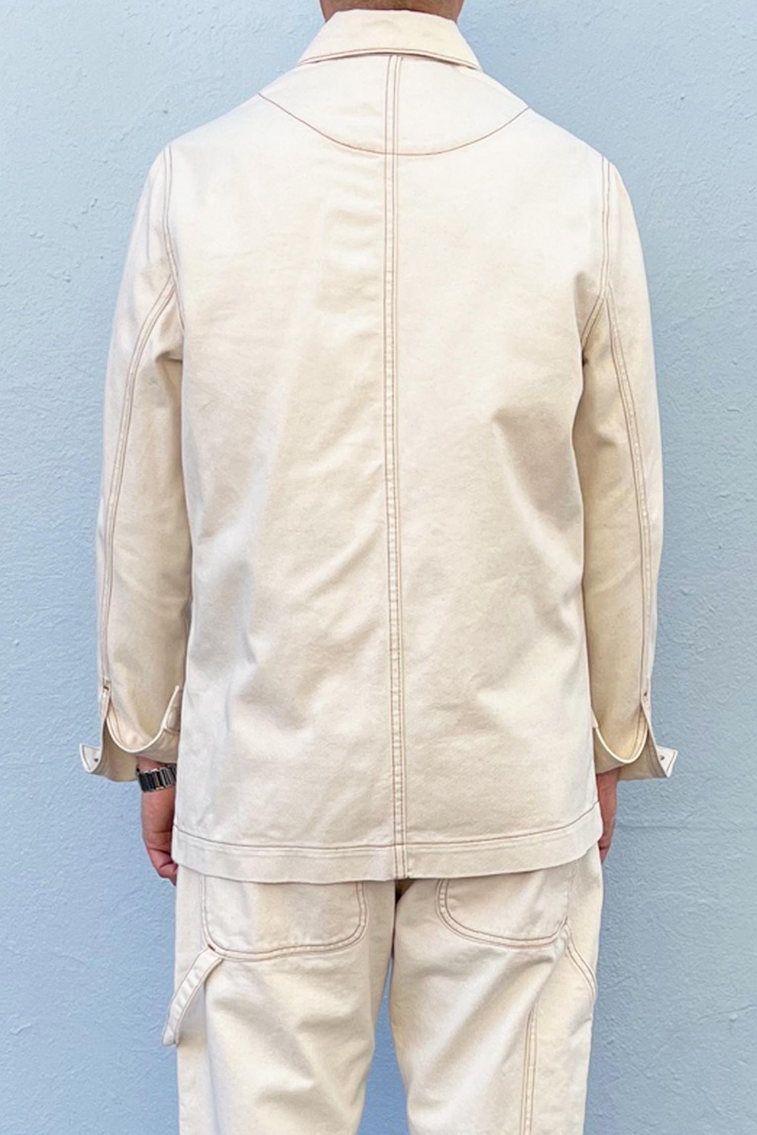 WORKER JACKET WHICH CAN ALSO BE USED FOR PLAY. NATURAL COLOR WITH GOLD CONTRAST STITCHING. IDEAL MID WEIGHT LAYER. 3 X FRONT PATCH POCKETS. SLEEVE CUFFS WITH BUTTON FASTENING. PRE-WASHED FOR A SOFT FEEL. FABRICATION: 100% COTTON MERCERISED. MADE IN MELBOURNE.